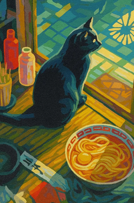 🍜🐱 Relax with this charming Cat and Noodles Paint by Numbers Kit! Featuring a curious black cat sitting by a warm bowl of ramen in a cozy kitchen setting, this DIY painting blends comfort, food, and feline charm. Perfect for cat lovers and foodies alike.