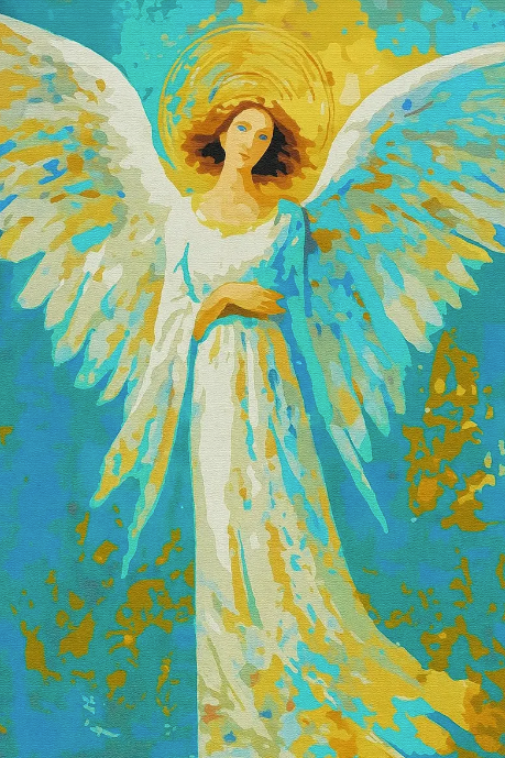 🎨 Heavenly blue and gold tones create a radiant spiritual glow