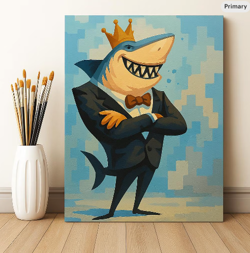 Make a splash with this quirky Paint by Number Kit, featuring a dapper cartoon shark in a tuxedo, bow tie, and golden crown. This hilarious undersea character is all confidence and charm—perfect for playful art lovers, ocean fans, and kids who love silly creatures with big personalities.