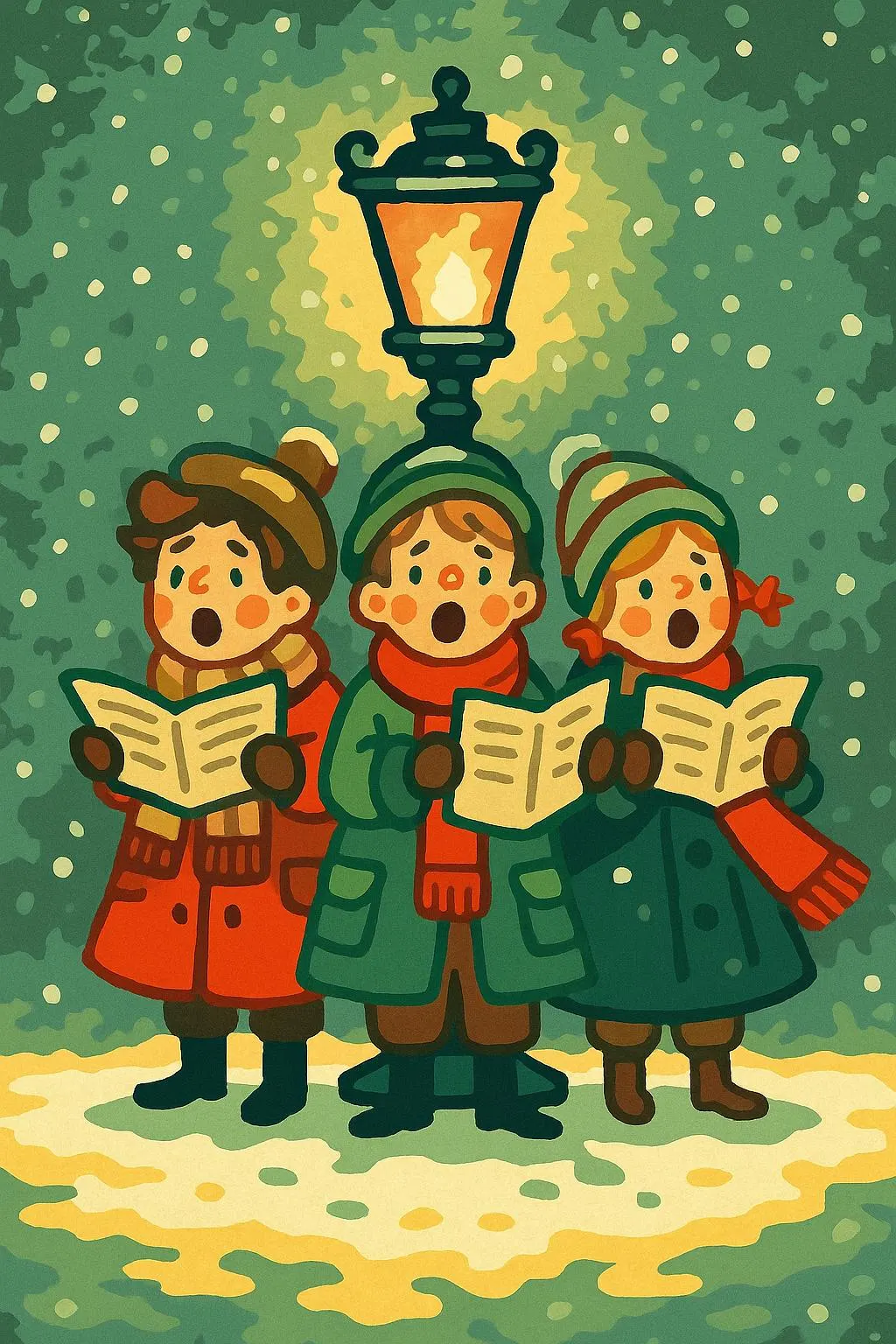Featuring three joyful carolers singing under a glowing lamplight as snow gently falls, this nostalgic artwork brings classic Christmas charm to your home.